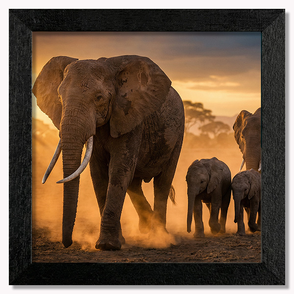 A breathtaking elephant herd walks through golden dust at sunset – an instant statement print full of warmth, drama, and family strength, available framed or unframed to transform any room