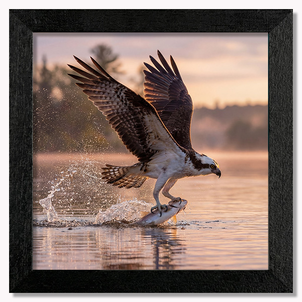 A breathtaking osprey launch at sunset – wings spread, water exploding into glittering spray – turns any wall into a moment of wild, golden-hour adrenaline (available framed or unframed)