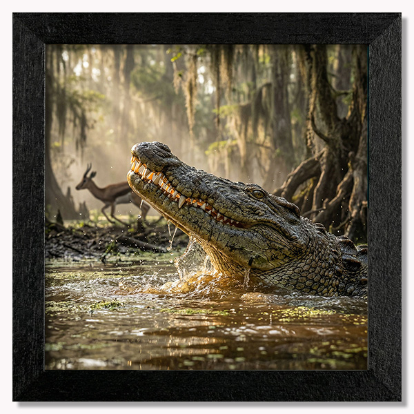 Swamp Titan Rising is a cinematic wetland scene – an immense crocodile breaking the surface in golden light – made to add instant drama and wild beauty to any room, framed or unframed